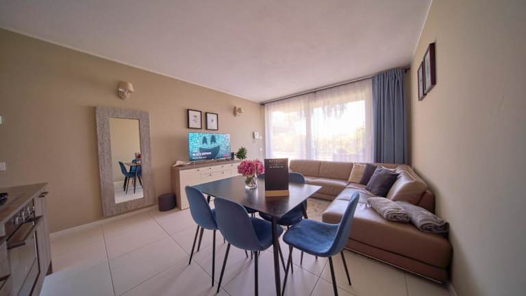 Die klimatisierte Ferienwohnung verfügt über 2 Schlafzimmer, ein Wohnzimmer mit einem Flachbild-TV, eine gut ausgestattete Küche, eine Terrasse mit Gartenblick sowie ein Badezimmer, das mit einem Bidet und einer Dusche ausgestattet ist.