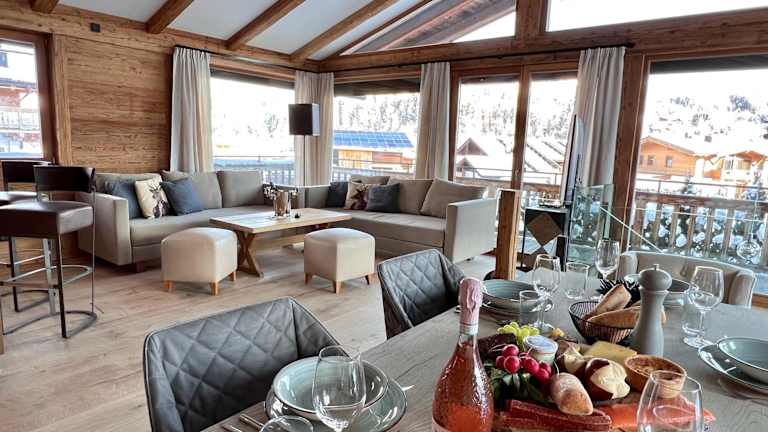 Die Unterkunft verfügt über vier Schlafzimmer und vier Badezimmer. Die Ausstattung umfasst Bettwäsche, Handtücher, einen Flachbild-TV, einen Essbereich sowie eine voll ausgestattete Küche. Eine Terrasse mit Blick auf die Berge ergänzt die Räume und bietet zusätzlichen Komfort für die Gäste.
