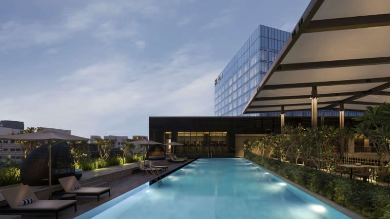 Hilton Bengaluru Embassy Manyata Business Park bietet Übernachtungsmöglichkeiten mit einem Außenpool. Zu den weiteren Annehmlichkeiten gehören ein kostenloser Privatparkplatz, ein Fitnesscenter und eine Gemeinschaftslounge. Die Unterkunft verfügt über eine Terrasse und eine Bar sowie einen Zimmerservice und eine rund um die Uhr besetzte Rezeption.