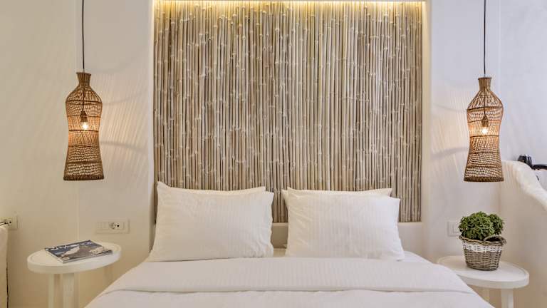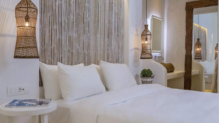 Die Zimmer und Suiten im Hippie Chic Hotel sind im Einklang mit der einheimischen Architektur gebaut und bieten eine elegante und gemütliche Atmosphäre. Alle Unterkünfte sind klimatisiert und verfügen über COCO-MAT Kingsize-Betten, Flachbild-TV und Minikühlschrank. Einige Zimmer bieten zudem eine uneingeschränkte Aussicht auf die Ägäis. Die meisten Zimmer und Suiten verfügen über eine eigene Veranda, die jedoch keinen visuellen Schutz bietet, um die wunderschöne Aussicht auf die Ägäis und die Insel Delos nicht zu beeinträchtigen.
