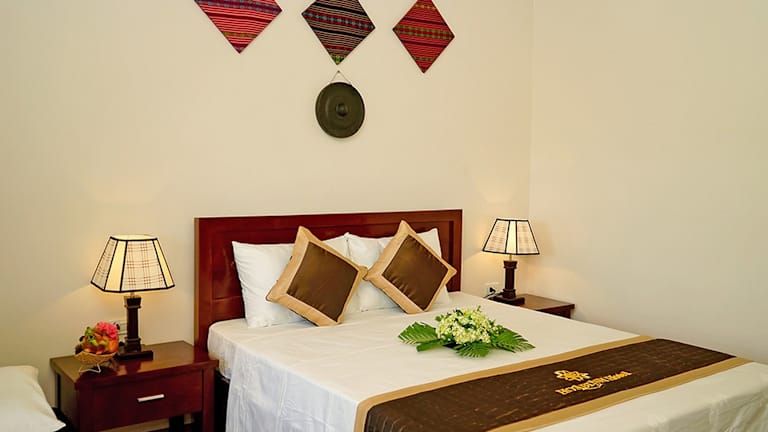 Die Zimmer im Hoa Binh Hotel sind modern eingerichtet und verfügen über Annehmlichkeiten wie einen Flachbild-Kabel-TV und eine iPod-Dockingstation. Einige Zimmer bieten zudem einen gemütlichen Sitzbereich und einen schönen Blick auf den Garten oder die Stadt. Jedes Zimmer verfügt über ein eigenes Badezimmer mit Bademänteln und Hausschuhen. WLAN nutzen Sie im gesamten Hotel kostenfrei.