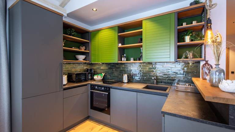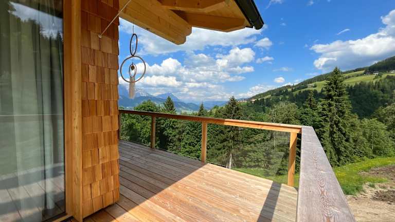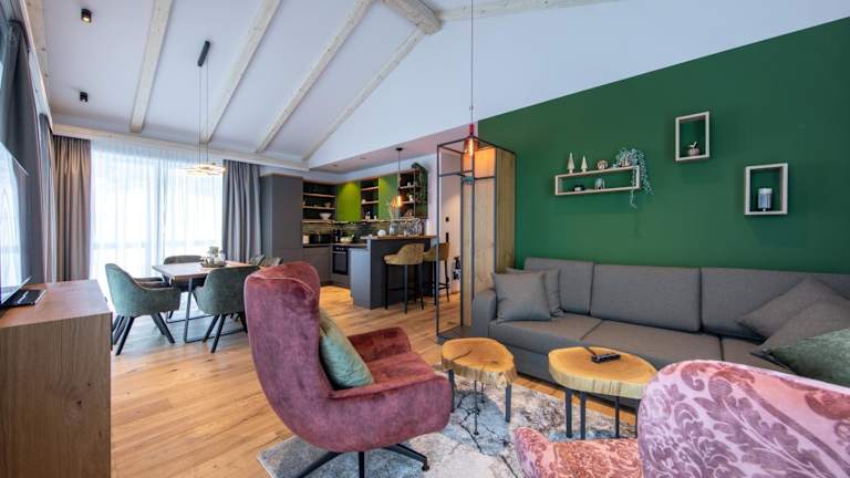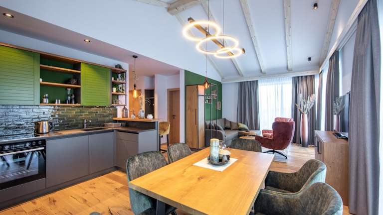Die Wohneinheiten der Höflehner Premium Eco Lodge sind mit Parkettböden ausgestattet und verfügen über eine voll ausgestattete Küche mit Kühlschrank, einen Essbereich, einen Flachbild-TV sowie ein eigenes Badezimmer mit Dusche und Haartrockner.
