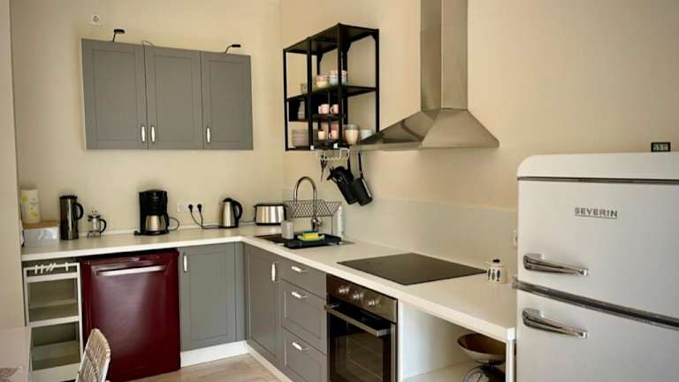 Die Küchenzeile der Unterkunft ist mit verschiedenen Geräten ausgestattet, darunter Kühlschrank, Geschirrspüler, Ofen und Herdplatte. Eine Grillmöglichkeit ist ebenfalls vorhanden. Es besteht die Möglichkeit, Lebensmittellieferungen in die Unterkunft zu bestellen. Die Unterbringung ermöglicht auch das Essen im Freien im Picknickbereich. Desinfektionsmaßnahmen für alle genutzten Teller und Bestecke wurden umgesetzt.