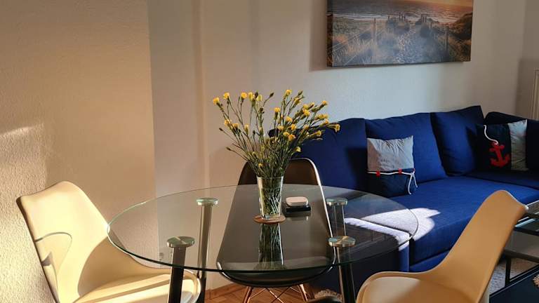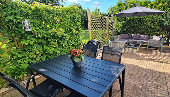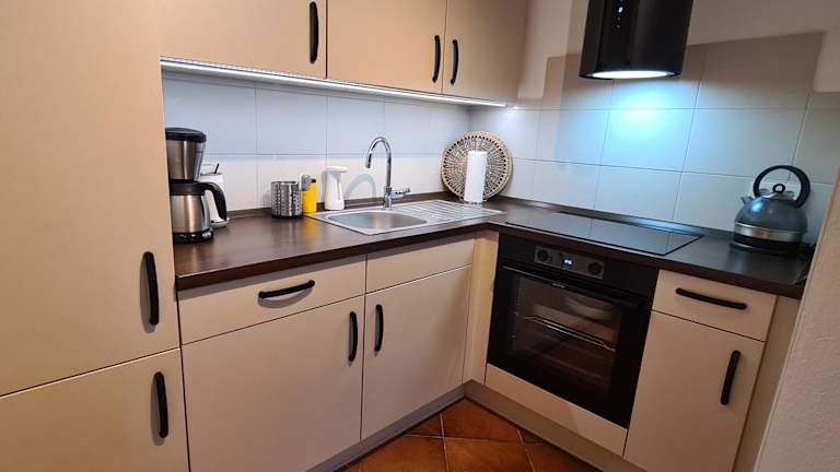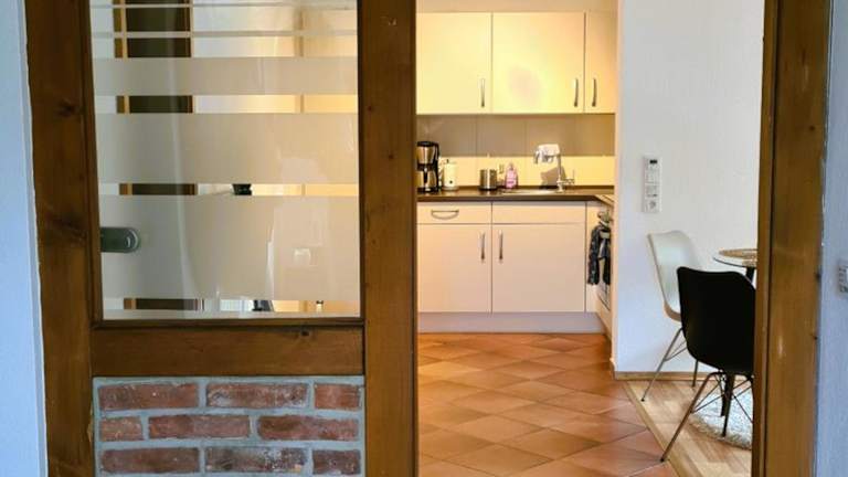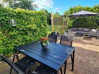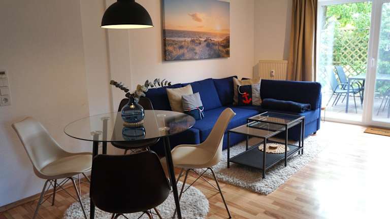 Die Ferienwohnung umfasst ein Schlafzimmer, ein Wohnzimmer und eine Terrasse mit Gartenblick. Zur Ausstattung gehören ein Flachbild-TV, eine gut ausgestattete Küchenzeile mit Kühlschrank und Geschirrspüler sowie ein Badezimmer mit Badewanne. Handtücher und Bettwäsche werden zur Verfügung gestellt.