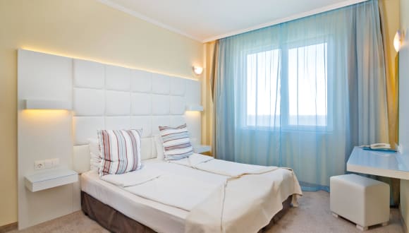 - Familienzimmer (40 m2), Doppelzimmer (35 m2); Nichtraucherzimmer; Alle Zimmer verfügen über einen Balkon mit Panoramablick (Strand od. Stadt). Alle Zimmer bieten Klimaanlage, eigenes Badezimmer (mit Dusche od. Wanne), Flachbild-TV, Haartrockner, Handtücher, Toilettenpapier. einen Flachbild-TV und eine Minibar. WLAN ist in allen Bereichen der Unterkunft kostenfrei verfügbar.