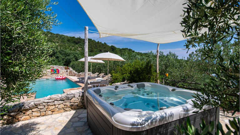 Das Ferienhaus umfasst 4 Schlafzimmer, ein Wohnzimmer sowie 4 Badezimmer, die mit einer Dusche und einem Whirlpool ausgestattet sind.