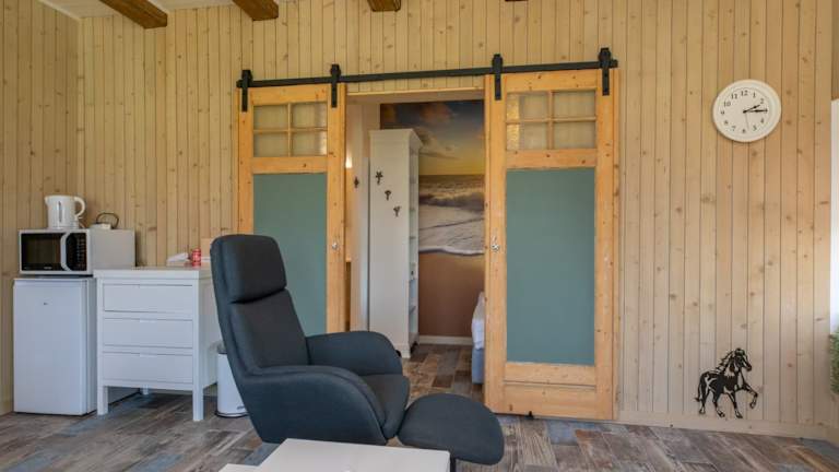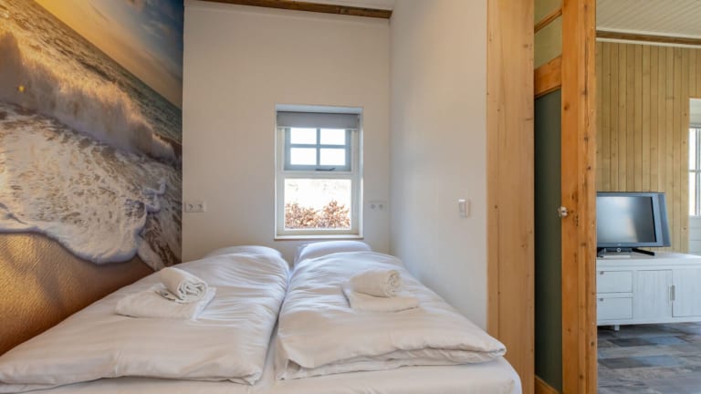 Das Ferienhaus verfügt über ein Schlafzimmer und eine komplett ausgestattete Küche mit Kühlschrank und Ofen. Handtücher und Bettwäsche werden bereitgestellt.