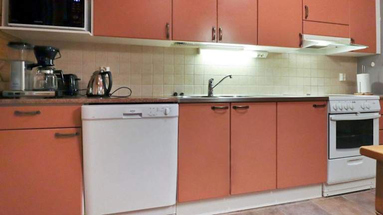 Das Ferienhaus ist ausgestattet mit einem TV und einer Küchenzeile, die Kühlschrank und Geschirrspüler umfasst.
