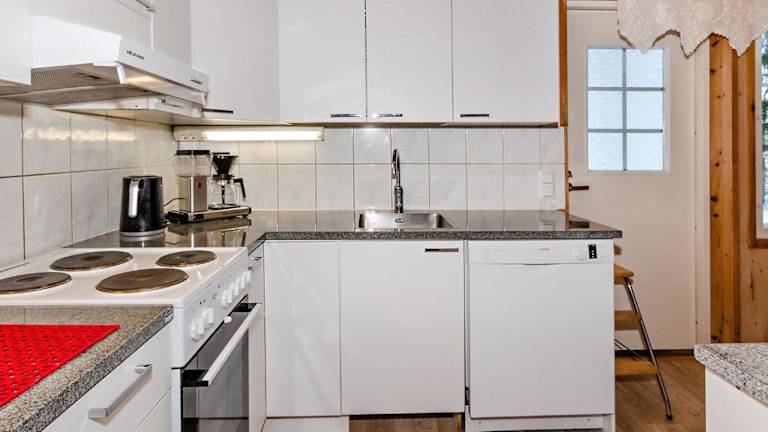 Das Ferienhaus ist eingerichtet mit einem TV und einer Küchenzeile, die mit einem Kühlschrank und einem Geschirrspüler ausgestattet ist.