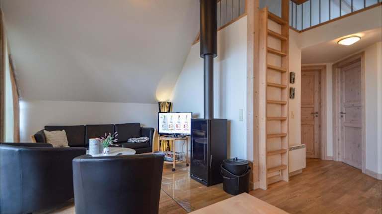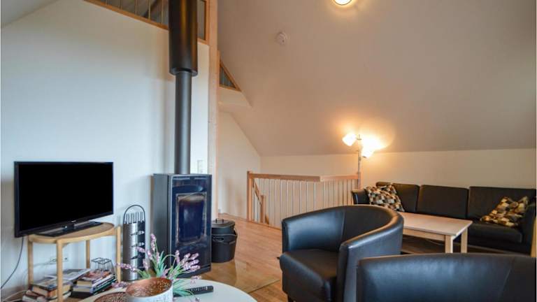 Das Ferienhaus verfügt über ein Wohnzimmer mit Kabel-TV und eine voll ausgestattete Küche, einschließlich eines Kühlschranks.