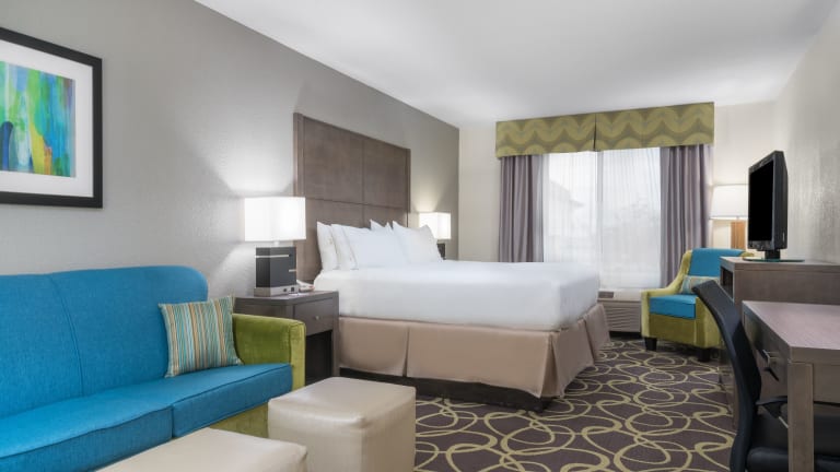 Die Zimmer sind klimatisiert und verfügen über Teppichböden sowie unterschiedliche Bettenarten wie Doppel- und Queensize-Betten. Zur Ausstattung gehören eine Mikrowelle, ein Kühlschrank, eine Tee-/Kaffeestation, ein Safe, ein Schreibtisch, Sat-TV, ein Radio, ein Wecker und kostenfreies WLAN. Die Bäder sind mit einer Dusche, einem Haartrockner und Kosmetikartikeln ausgestattet. Spezielle rollstuhlgerechte Zimmer stehen ebenfalls zur Verfügung.