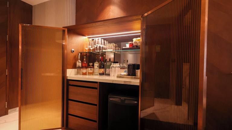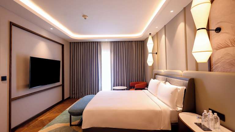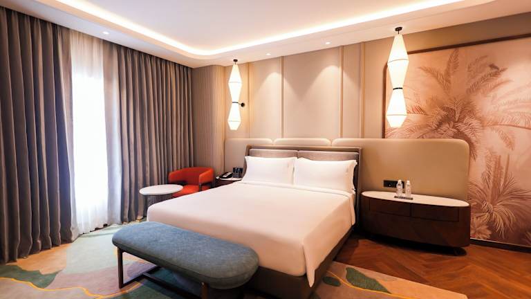 Die Zimmer sind stylisch und modern eingerichtet und verfügen über Annehmlichkeiten wie Klimaanlage, eine Minibar, ein Telefon mit Direktwahl sowie Hochgeschwindigkeits-WLAN. Zu den weiteren Annehmlichkeiten gehören ein Safe, eine Tee-/Kaffeemaschine und Hausschuhe. Die Badezimmer sind mit Dusche und Badewanne ausgestattet sowie mit Kosmetikartikeln und Handtüchern.