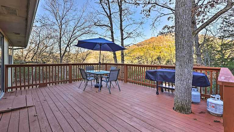 Holiday Island Home Mountain View and Hot Tub! bietet klimatisierte Unterkunftsmöglichkeiten mit einem Balkon sowie kostenlosem WLAN. Die Unterkunft umfasst ein Erdgeschoss-Ferienhaus mit zwei Schlafzimmern, einer gut eingerichteten Küche, einem Wohnzimmer und einem Flachbild-TV. Ein Wellness-Bereich und ein Whirlpool stehen ebenfalls zur Verfügung.