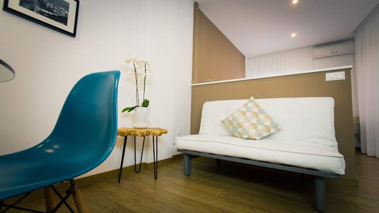 Das klimatisierte Apartment im Holidays2Malaga Malagueta Studio verfügt über ein komfortables Schlafzimmer, ein gemütliches Wohnzimmer und eine voll ausgestattete Küche. Hier finden Sie alles, was Sie für einen angenehmen Aufenthalt benötigen, einschließlich Kühlschrank und Kaffeemaschine. Das Apartment verfügt auch über ein eigenes Badezimmer mit Dusche und Haartrockner. Handtücher und Bettwäsche werden gestellt, um Ihren Aufenthalt so bequem wie möglich zu gestalten.