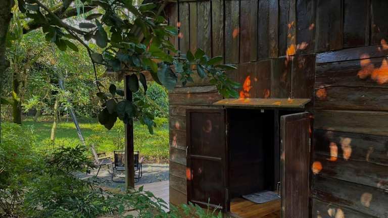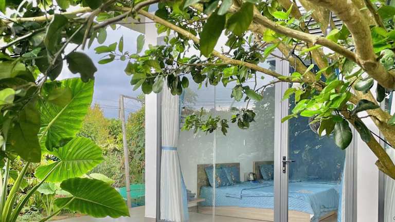 Entspannen Sie sich im schönen Garten des Homestay Vườn Trái Cây Nhiệt Đới VÔ ƯU GARDEN und genießen Sie die ruhige Atmosphäre. Die Terrasse lädt zum Verweilen und Entspannen ein. Nutzen Sie die Zeit, um die Umgebung zu erkunden und die malerische Landschaft zu genießen.