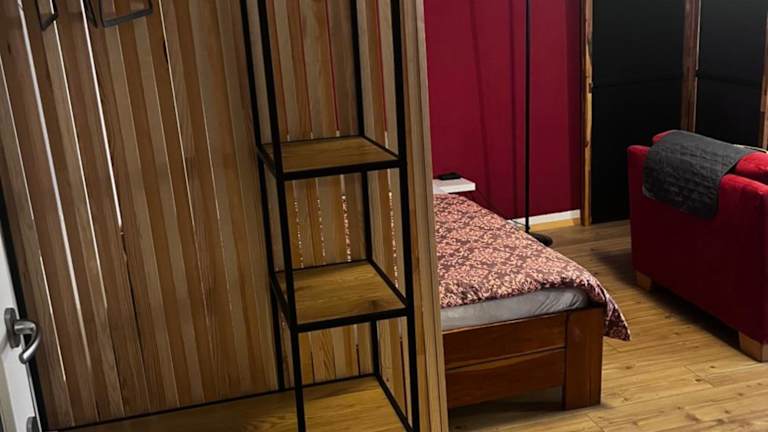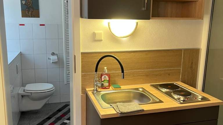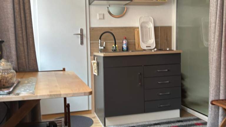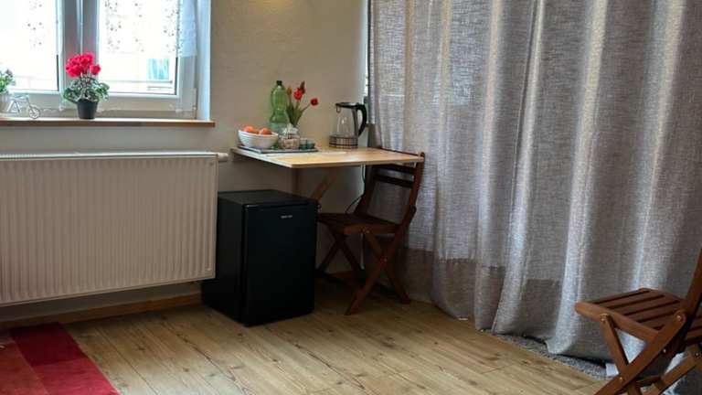 Die Ferienwohnung besteht aus einem Schlafzimmer, einem Wohnzimmer und einer voll ausgestatteten Küchenzeile, die einen Kühlschrank und einen Wasserkocher umfasst. Des Weiteren beinhaltet die Unterkunft ein Badezimmer mit Dusche. Bettwäsche und Handtücher werden bereitgestellt. Zudem bietet die Unterkunft einen Gartenbereich mit Gartenmöbeln.