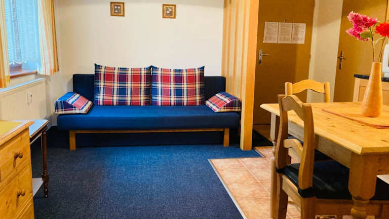 Die Ferienwohnung verfügt über ein Wohnzimmer mit einem Flachbild-TV, eine voll ausgestattete Küchenzeile mit Kühlschrank und Geschirrspüler, sowie ein Badezimmer mit Dusche. Handtücher und Bettwäsche werden bereitgestellt.