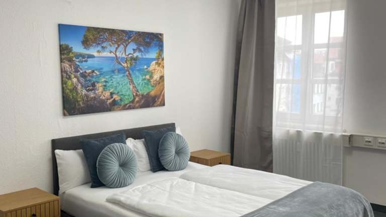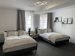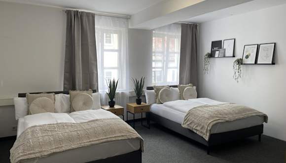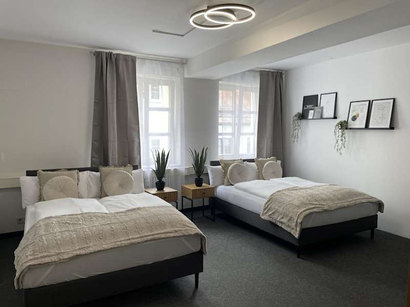 Jedes Zimmer in der Unterkunft Hossi-Rathaus ist mit einem Kleiderschrank ausgestattet. Die Zimmer verfügen über ein Gemeinschaftsbad mit Dusche und Haartrockner sowie Stadtblick. Des Weiteren sind die Zimmer mit einem Schreibtisch und einem Flachbild-TV versehen.