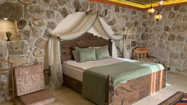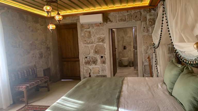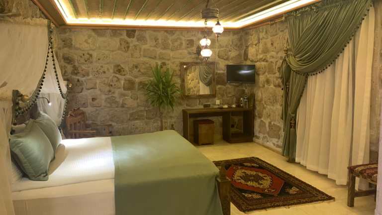 Das Walnut House Hotel bietet rustikale Zimmer mit traditionellen Gewölbedecken, die den Charme der türkischen Kultur widerspiegeln. Jedes Zimmer ist mit lokalen Materialien ausgestattet und verfügt über Annehmlichkeiten wie Telefon, Schreibtisch und privates Badezimmer mit Haartrockner. Während der Wintersaison steht eine Heizungsanlage zur Verfügung, um den Gästen einen angenehmen Aufenthalt zu ermöglichen. Die authentische türkische Lounge des Hotels lädt mit ihren lokal gefertigten Teppichen und gemütlichen Sitzbereichen zum Entspannen ein. Hier finden Sie auch einen Fernseher mit internationalen Kanälen und eine Auswahl an Getränken.