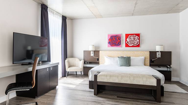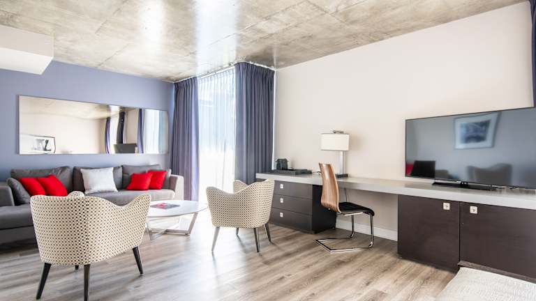Die Zimmer sind geräumig, mit Designermöbeln eingerichtet und verfügen über eine Klimaanlage sowie Heizung. Weitere Annehmlichkeiten sind ein Kingsizebett, ein Sofabett, ein Schreibtisch, ein Safe, eine Minibar, ein TV-Gerät, ein Radio und eine Tee-/Kaffeemaschine. Die Badezimmer sind mit einer Dusche oder Badewanne, Haartrockner, Bademänteln und Kosmetikartikeln ausgestattet. Es stehen auch rollstuhlgerechte Zimmer zur Verfügung.