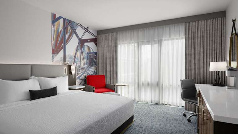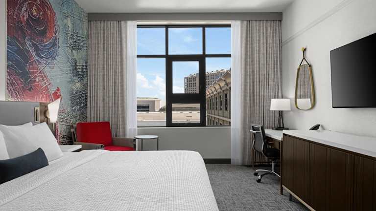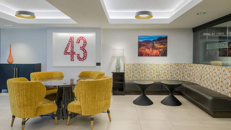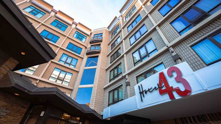 Die Zimmer im Hotel 43 sind in modernen, kräftigen Farben gehalten und bieten eine wunderschöne Einrichtung. Jedes Zimmer verfügt über luxuriöse Bettwäsche und ein eigenes Badezimmer. Die Deluxe Zimmer sind mit einem 50-Zoll-HD-TV, Designer-Annehmlichkeiten und Bademänteln ausgestattet, um Ihren Aufenthalt so angenehm wie möglich zu gestalten. Das Hotel ist auch haustierfreundlich, so dass Sie Ihren pelzigen Freund mitbringen können.