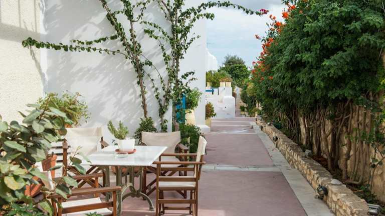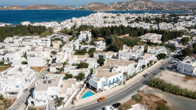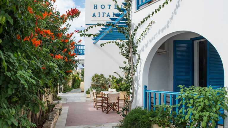 Das Hotel Aegeon liegt im Zentrum von Parikia, nur wenige Gehminuten vom Aghia Anna Strand und dem Hafengebiet entfernt. Die Stadt Naousa ist etwa 11 km entfernt und kann bequem erreicht werden.