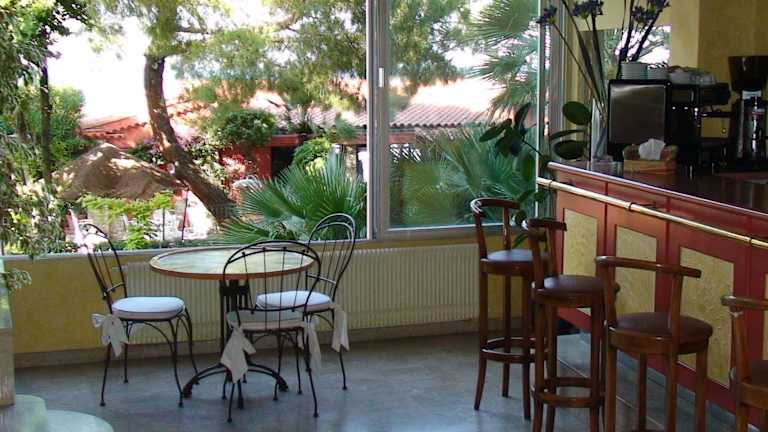 Auf der Terrasse des Hôtels können Sie das schöne Wetter genießen und sich entspannen.