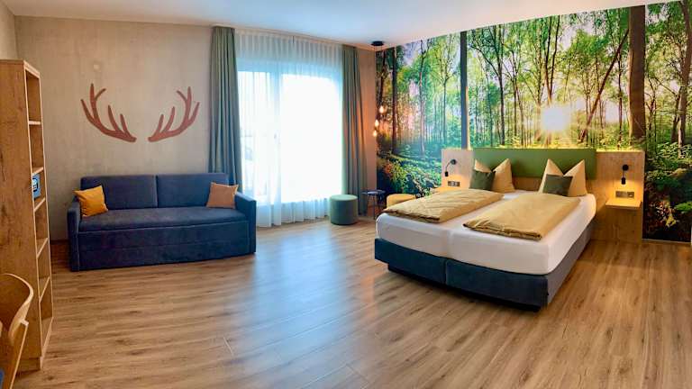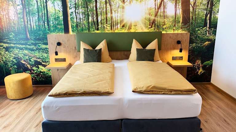 Im neugebauten Hotel am Sonnenlandpark erwarten Sie 54 moderne Zimmer im stilvollen Design: - Lichtdurchflutet durch große Fenster und moderne Lichtobjekte - natürliche Elemente in Holz- und Betonoptik sowie eine Waldpanorama-Wand - Smart-TV und Zimmersafe gehören zum Standard - komfortable geräumige Bäder mit Dusche, WC, Fön, Kosmetikspiegel Buchbar sind verschiedene Zimmerkategorien von Einzel-, Doppel- bis Familienzimmer. Vier barrierefreie Komfortzimmer und zusätzlich zwei rollstuhlgerechte Doppelzimmer komplettieren unser Angebot.
