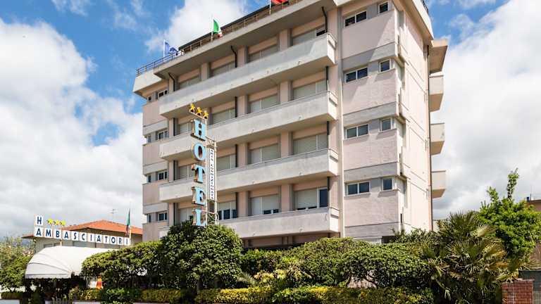 Das Hotel Ambasciatori liegt direkt an der Strandpromenade von Marina di Pietrasanta. Die Innenstadt und der Bahnhof von Pietrasanta sind nur 5 km entfernt. Eine Bushaltestelle mit Verbindungen nach Forte dei Marmi, Pisa und Florenz befindet sich nur 50 m vom Hotel entfernt. Die Stadt Viareggio erreichen Sie in 10 Fahrminuten.