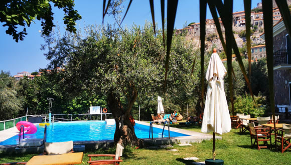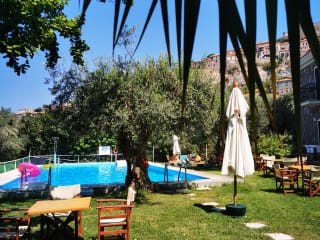 Das Hotel verfügt über einen Außenpool und eine Sonnenterrasse, auf der die Gäste Liegestühle und Schirme nutzen können.