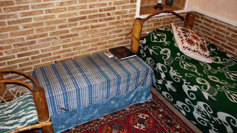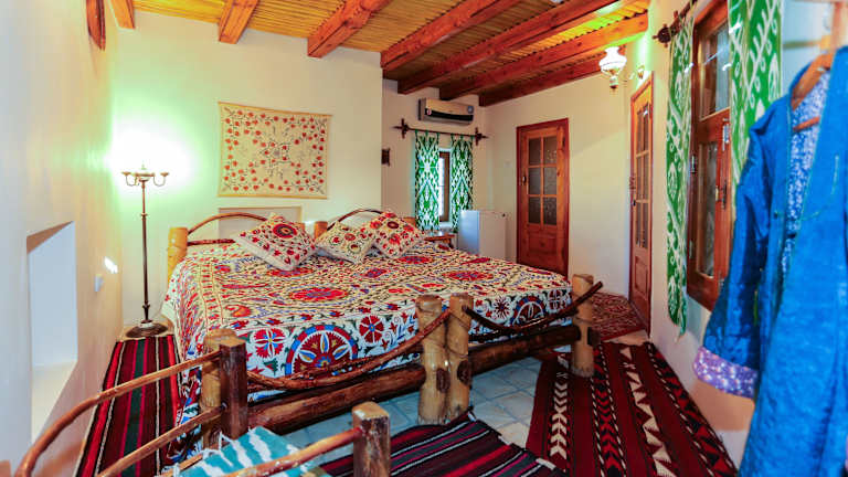 Die klimatisierten Zimmer im Amulet Hotel sind im traditionellen usbekischen Stil gestaltet und bieten ein authentisches Erlebnis. Jedes Zimmer ist individuell eingerichtet und verfügt über gewebte Teppiche und Holzbalkendecken. Zur Ausstattung gehören Sat-TV, ein Kühlschrank und ein eigenes Bad.