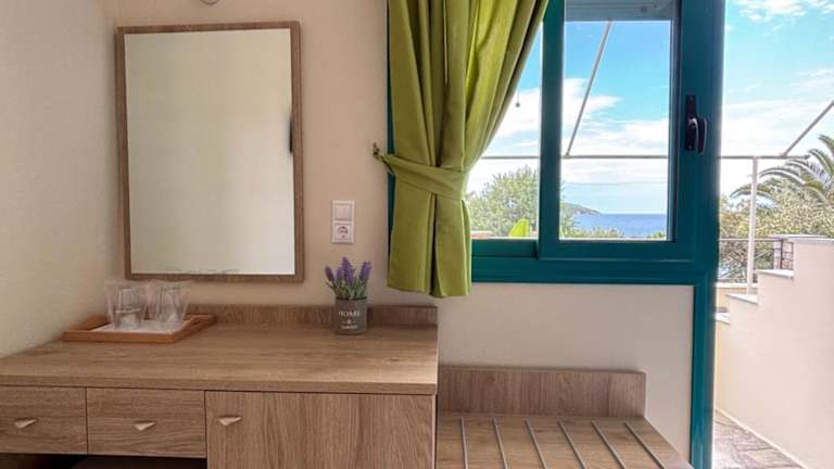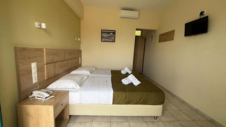 Die klimatisierten Zimmer im Angeliki Beach Hotel verfügen alle über einen Balkon mit Meerblick. Zur Ausstattung gehören ein TV, ein Telefon und ein Kühlschrank. Genießen Sie die malerische Aussicht auf den Garten und das Mittelmeer von Ihrem eigenen Balkon aus.