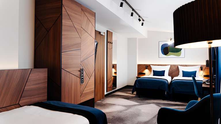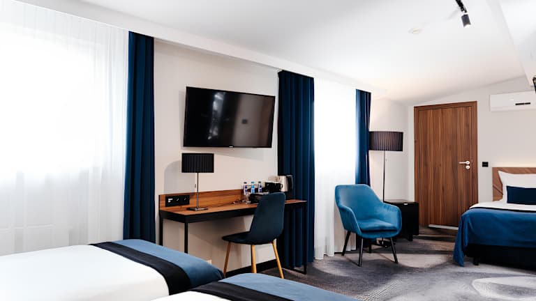 Die Zimmer sind klimatisiert und individuell beheizbar, ausgestattet mit Teppichboden, Minibar, Safe und einem Schreibtisch. Zur Grundausstattung gehören ein Telefon mit Direktwahl, ein TV-Gerät, ein Radio sowie kostenloses WLAN. Die Badezimmer sind mit Dusche und Badewanne ausgestattet und es sind rollstuhlgerechte Zimmer verfügbar.