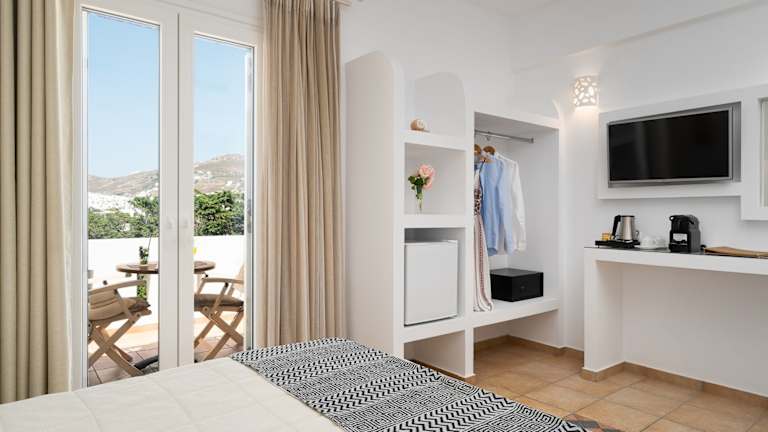 Das Hotel verfügt über 26 komfortable Zimmer, die mit modernen Annehmlichkeiten ausgestattet sind. Genießen Sie den Blick auf Naxos Stadt, das Meer oder die Berge von Ihrem eigenen Balkon oder Ihrer Terrasse. Die Zimmer bieten eine Klimaanlage, einen Safe, eine Minibar und kostenloses WLAN.