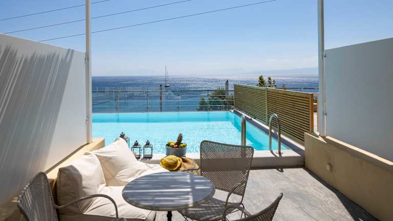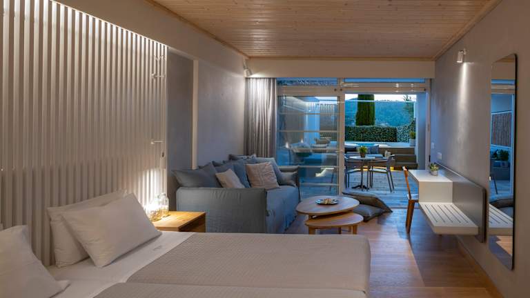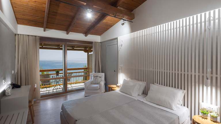 Alle Gästezimmer (Standard Doppelzimmer, Doppelzimmer mit Garten-Whirlpool, Superior Doppelzimmer, Familienzimmer, Junior Suite, Maisonette und Junior Suite mit privatem Pool) verfügen über geräumige private Balkone oder Terrassen mit Blick auf das Meer. Jedes Zimmer ist mit Direktwahltelefon, Satellitenfernsehen, W-LAN, Safe, Kühlschrank, Klimaanlage, Badezimmer mit Badewanne, Dusche, Haartrockner und Kosmetik ausgestattet.