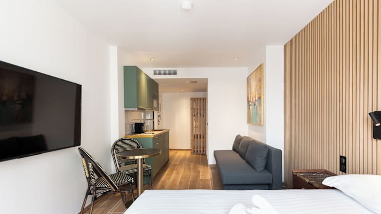 Die Zimmer sind mit einem Doppelbett oder einem Sofabett ausgestattet und verfügen über Heizung, WLAN, einen TV mit Satellitenempfang, einen Safe sowie ein eigenes Bad mit Haartrockner. Das Hotel bietet zudem Familien- und Nichtraucherzimmer.
