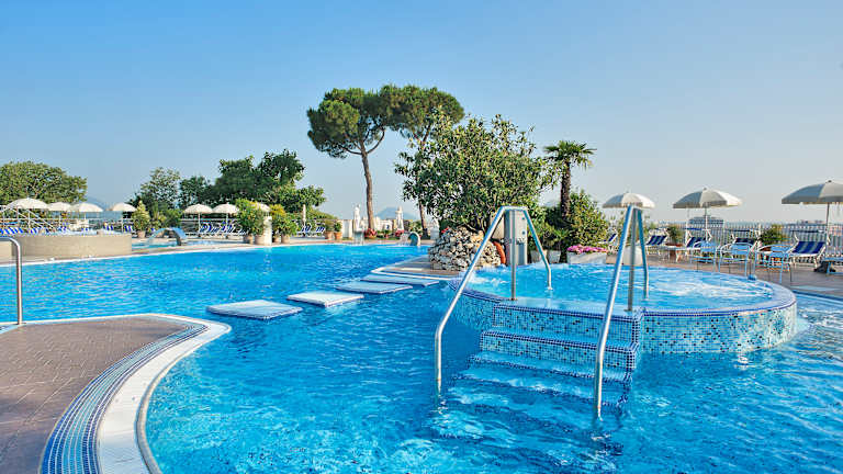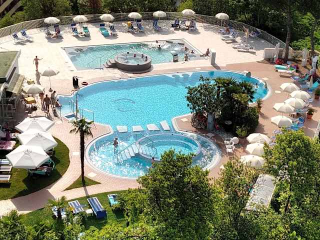 Ein Alleinstellungsmerkmal des Hotels Terme Augustus sind mit Sicherheit die 3 Thermalschwimmbecken mit Panoramablick, die in den Euganeischen Thermen einzigartig sind. Die Thermalschwimmbecken befinden sich oben auf dem Hügel neben dem Hauptgebäude und sind vom sechsten Stock des Hotels aus über eine praktische Brücke erreichbar. Das Thermalschwimmbecken im Innenbereich verfügt über Aqua-Cycling und Hydromassage. Daneben befinden sich eine finnische Sauna und emotionale Duschen. Die bequemen Liegen am Rand des Schwimmbeckens bieten sich für entspannte Momente an. Die anderen beiden Thermalschwimmbecken befinden sich im Außenbereich. Das erste Thermalschwimmbecken ist mit Hydromassage, Kaskaden, japanischem Parcour und Jacuzzi-Becken ausgestattet. Das andere Thermalschwimmbecken hat eine etwas niedrigere Wassertemperatur und ist für Gäste gedacht, die auch im Urlaub in den Thermen nicht darauf verzichten möchten, ein paar Bahnen zu schwimmen. Von den Thermalschwimmbecken aus hat man in alle Richtungen einen wundervollen Ausblick, der von der Stadt Abano über die Stadt Montegrotto bis zu den malerischen Euganeischen Hügeln reicht, die zu jeder Jahreszeit ein großartiges Panorama bieten. Von den Thermalschwimmbecken hat man Zugang zu einer großen Sonnenterrasse, auf der die Hotelgäste die Sonne und die Stille vor diesem wundervollen Panorama genießen können.