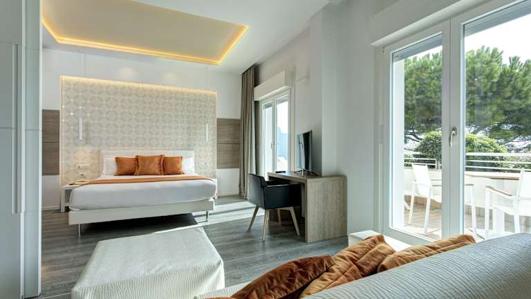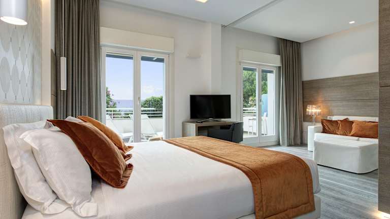 Die klimatisierten Zimmer im Hotel Aurora bieten einen Balkon mit Tisch und Stühlen, von dem aus Sie einen Blick auf das Meer oder die Piazza Aurora genießen können. Jedes Zimmer ist mit einem LCD-Sat-TV und einem eigenen Bad mit Haartrockner und Pflegeprodukten ausgestattet.