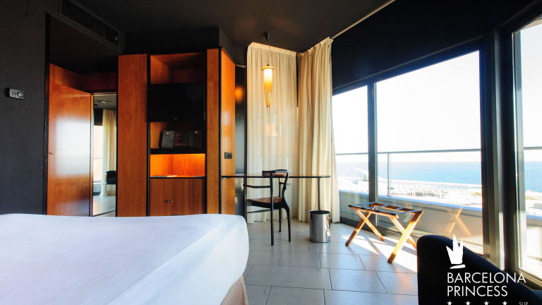 Die Zimmer im Barcelona Princess Hotel sind elegant gestaltet und bieten einen herrlichen Meerblick vom Balkon oder der Terrasse aus. Jedes Zimmer ist modern eingerichtet und verfügt über ein Doppelbett, einen Safe, eine Minibar und einen Schreibtisch. Zur Standardausstattung gehören außerdem ein Telefon mit Direktwahl, ein TV-Gerät mit Satelliten-/Kabelempfang, ein Radio, ein Wecker und kostenfreies WLAN. Die Badezimmer sind mit einer Dusche, einer Badewanne, einem Haartrockner und Bademänteln ausgestattet.