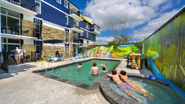 Das Hotel Lava Lodge in Rotorua bietet eine ideale Lage im Stadtzentrum mit Blick auf den Geothermalpark Kuirau. Es verfügt über einen beheizten Außenpool und kostenfreie Parkplätze. Das Hostel bietet sowohl Schlafsäle als auch private Zimmer mit eigenem Bad. Im Innenhof können Sie entspannen und das Personal steht Ihnen gerne mit Reisetipps und der Organisation von Ausflügen zur Seite. Die Bar verfügt über einen Großbild-TV und eine Sonnenterrasse, und an den meisten Abenden gibt es einen DJ. Restaurants und ein Einkaufszentrum sind nur wenige Gehminuten entfernt.