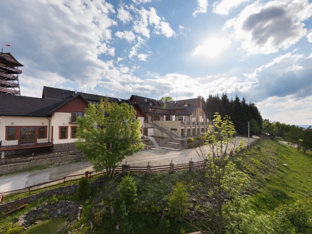Hotel położony na szczycie góry jako kompleks trzech budynków (budynek główny, budynek SPA, budynek Karczmy) z 86 pokojami o łącznej ilości 220 miejsc (na oddzielnych łóżkach/dostawkach). Do dyspozycji Gości Restauracja, Bar, Kręgielnia, Wieża Widokowa, Mini ZOO, Korty tenisowe zamiennie z boiskiem do siatkówki/kometki.