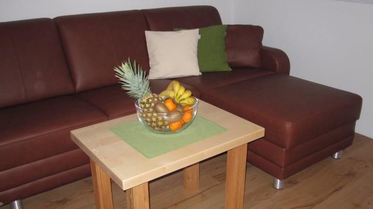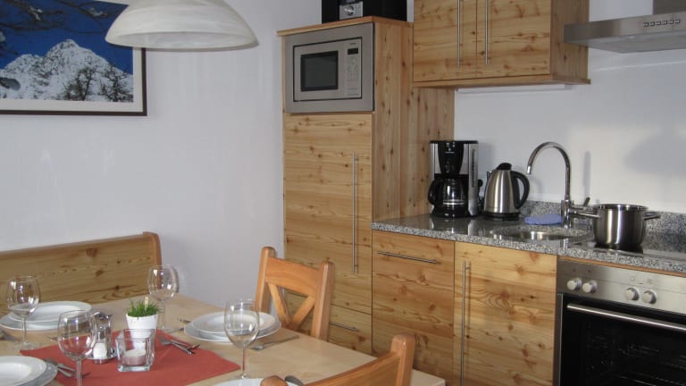 Die, mit Massivholzmöbeln ausgestattete Wohnung besteht aus einer großzügigen, komplett eingerichteten Wohnküche mit ausziehbarer Ledercouch und Flat TV, einem eigenen Balkon mit einer kleinen Naschecke und einer Sitzecke, einem Doppelzimmer mit Zirbenbetten und einem Badezimmer mit Dusche/WC und Handtuchtrockner. Eine unserer drei Ferienwohnungen verfügt auch über ein zweites Schlafzimmer.