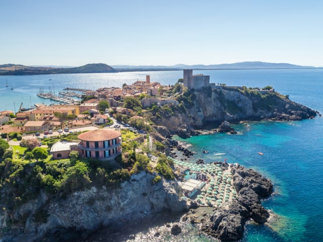 Capo D’Uomoist ein Hotel auf der Klippe von Talamone, einem malerischen Dorf von Seeleuten und Fischern. Eine runde Form, die in den Felsen eingelassen und von terrassenförmig angelegten Gärten umgeben ist, von denen aus man zum Meer von Cala Regina hinabsteigt. Jedes Zimmer bietet eine herrliche Aussicht und die Sommerwinde bringen Ihnen die Geräusche und Düfte des Meeres. Gehen Sie auf Ihren Balkon hinaus und genießen Sie einen Drink, während Sie sich im zauberhaften Blau des Mittelmeers verlieren.