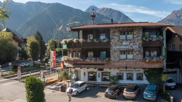 Das Hotel Landhaus Carla befindet sich am Eingang von Mayrhofen im Zillertal. Es liegt nur 3 Gehminuten vom Stadtzentrum entfernt und ist somit gut erreichbar. Die Bushaltestelle zu den Seilbahnen Mayrhofen und Zillertaler Gletscher befindet sich direkt vor dem Hotel, was eine bequeme Anbindung an die Skigebiete bietet. In der Umgebung gibt es auch Einkaufsmöglichkeiten und Restaurants, die zu Fuß erreichbar sind.