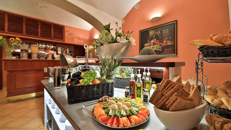Das Hotel Carlton bietet ein Restaurant, einen Frühstückssaal und eine Bar. Es kann Übernachtung inklusive Frühstück oder Halbpension gebucht werden. Das Frühstück wird täglich als Buffet serviert. Das Abendessen wird à la carte angeboten und besteht aus einem 5-Gänge-Menü. Die gastronomischen Einrichtungen bieten auch ausgewählte Getränke und Weinproben an.