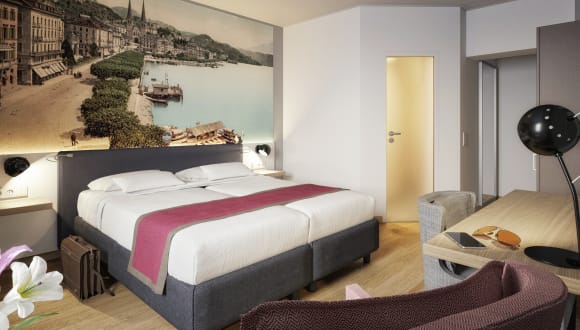Komplett neue, helle Möbel, traumhaft hohe Matratzen, blütenfrische Bettwäsche, sanfte Beleuchtung, echte Holzböden und Bäder mit Dusche oder Badewanne en suite – das sind unsere Comfort-Zimmer. Beim Betreten der Zimmer beeindrucken die wanddeckenden Kunstbilder mit Nostalgie-Sujets der Stadt Luzern um 1900. Diese und die vier auserlesenen Farbpaletten Karminrot, Königsblau, Senfgelb und Bordeaux verleihen jedem Raum eine individuelle Note. Nichts wirkt fehl am Platz, nichts aufdringlich. Eigentlich viel zu schade, um die Augen zu schliessen.