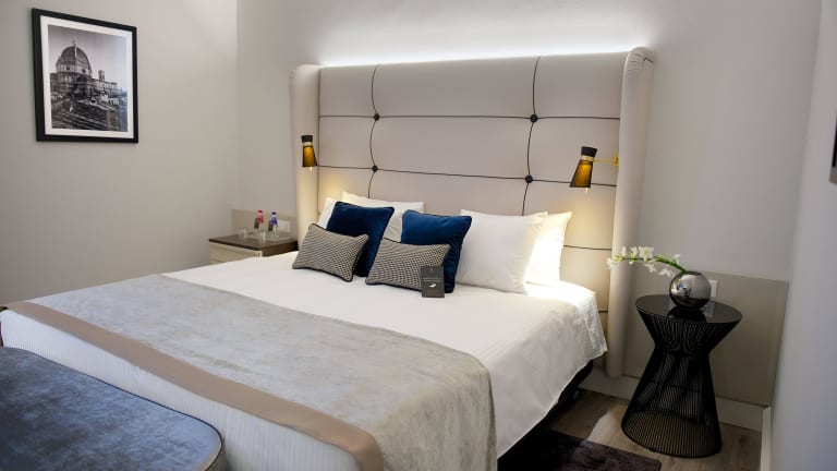 Die modernen Zimmer im Hotel Cerretani Firenze - MGallery Collection sind klimatisiert und bieten WLAN, eine Minibar und Sat-TV mit Pay-per-View-Kanälen. Jedes Zimmer ist elegant eingerichtet und verfügt über ein eigenes Bad mit luxuriösen Hausschuhen.
