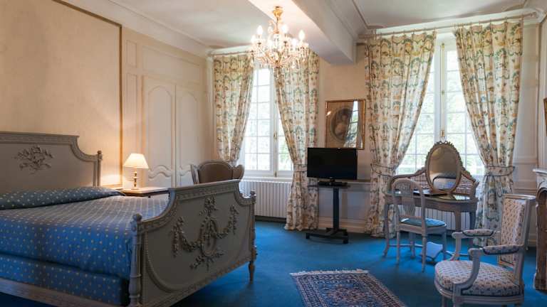 Die 17 Zimmer des Château du Landel sind raffiniert und individuell eingerichtet. Sie verbinden traditionellen Charme mit modernen Annehmlichkeiten wie Sat-TV und eigenem Bad. Ein eleganter Wohnbereich lädt zum Entspannen ein.