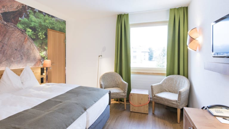 Jedes der gemütlichen, modernen Zimmer ist individuell eingerichtet und mit einem grossen Engadiner Bild aus der Natur, die Budget Doppelzimmer mit einem Märlibild geschmückt. Sämtliche Badezimmer sind modern und hell. Alle Zimmer verfügen über Telefon, Sat-TV, Radio, Highspeed-Internet und einen Safe.