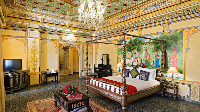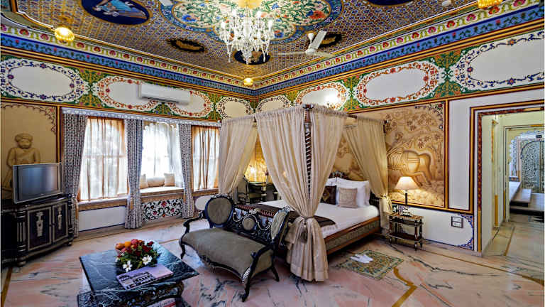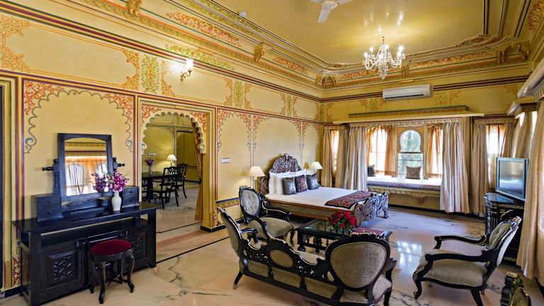 Die Zimmer im Chunda Palace sind geräumig, luxuriös eingerichtet und verfügen über handgemalte Fresken sowie große Bogenfenster. Zur Ausstattung gehören ein Flachbild-Sat-TV, ein Safe und ein Whirlpool. Einige Zimmer bieten zudem einen herrlichen Blick auf das Aravalligebirge. WLAN steht Ihnen im gesamten Hotel zur Verfügung.